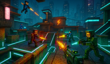 Playarena, canlı bir siberpunk estetiğini dinamik oyunla birleştirerek taktiksel harekete ve rekabet deneyimini yükselten çeşitli silah özelleştirmelerine olanak tanır.