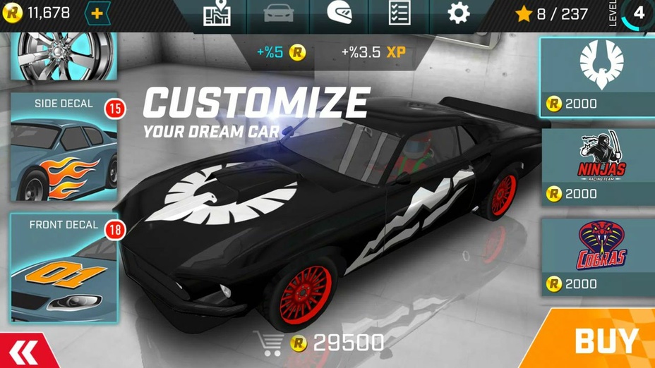 Motor, frenler ve nitro gibi yönleri yükselterek çeşitli güçlü spor arabaları özelleştirebilirsiniz.